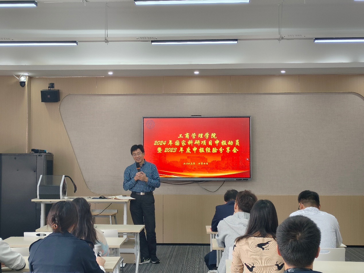 于10月10日下午13:30在5号楼411教室举行2024年国家科研项目申报动员暨2023年度申报经验分享会。工商学院院长王建明教授和学院30多位教师出席了本次会议,会议由学院副院长戴维奇教授主持。