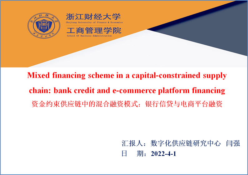 为了推动学院数字管理学科建设,推动专业的数字化转型,学院专门开设了数字管理论坛暨院级研究中心学术交流会。2022年4月1下午,数字化供应链研究中心负责人闫强博士作了题为“Mixed financing scheme in a capital-constrained supply chain: bank credit and e-commerce platform financing(资金约束供应链中的混合融资模式:银行信贷与电商平台融资)”的学术报告。