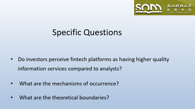 在报告中,范晓明老师指出依据组织信息处理理论,投资者会认为金融科技平台信息服务质量高于分析师,且可以由信息规划综合性来解释。但是他还强调,不同经济环境背景下的个体投资者对金融信息服务者提供的信息服务质量评价存在差异。