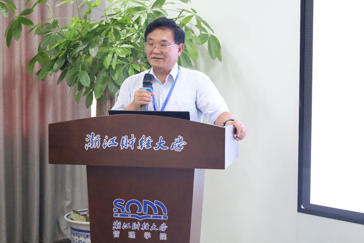 上午下半场由浙江财经大学宣传部部长王正新教授主持,华东交通大学副校长欧阳志刚教授、中国人民大学李勇教授作报告。欧阳志刚教授分享了主题为“金融资源、生产要素配置与全要素生产率”的学术报告。生产要素创新性配置是发展新质生产力、推动经济高质量发展的一个重要渠道,研究构建了一个包括融资部门金融资源配置和生产部门生产要素配置的理论分析框架,并基于中国企业中间投入占比较高的现状,在考虑实物资本和劳动两种生产要素的基础上进一步引入了中间投入,系统地测算并分析了不同类型的金融资源配置对各种生产要素配置及全要素生产率的影响。李勇教授分享了“基于大数据的贝叶斯统计推断研究进展及其应用”。研究针对海量数据下模型设定偏差的模型比较问题,提出两种新的基于惩罚的预测信息准则:先借助变分贝叶斯后验分布,从预测视角推导出变分插入预测分布和变分后验预测分布两类预测分布,接着研究了与这两类分布相关、以数据生成过程和预测分布间KL散度期望定义的风险函数,在特定正则条件下证明所提信息准则是各自风险函数的渐近无偏估计量,最后验证了其在海量数据模型设定偏差场景下模型比较的性能。