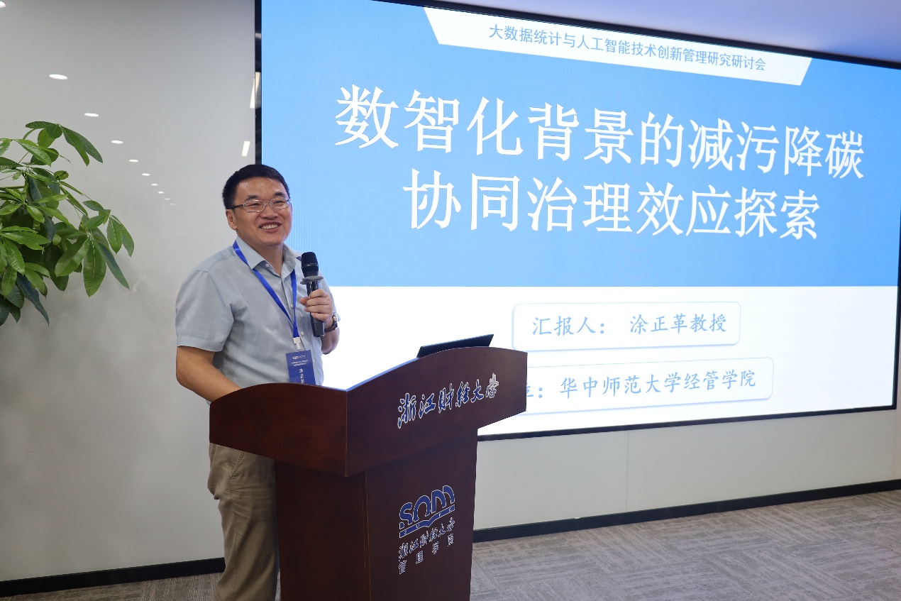 院长涂正革教授、华侨大学胡日东教授两位专家特邀报告。涂正革教授分享了“大数据赋能减污降碳协同治理:理论逻辑、实践路径与案例验证”。他指出面对污染源复杂多样、分散难控的挑战,数智化治理上在政策监测排放上已经取得较好成效,未来必须探索更多应用的治理场景,尤其是对数智化绿色生产的赋能,带动源头生产中的减污降碳协同效应。胡日东教授围绕“地区上下游人工智能发展对民营企业‘走出去’的影响研究”进行报告。他提出“地区上下游人工智能发展是否影响以及如何影响民营企业‘走出去’?存在怎样的差异化效应和演变规律?”等议题。他的研究发现下游AI发展显著促进民营企业“走出去”,而上游AI发展的影响相对较弱,证实了AI产业发展存在明显的方向性差异,提出适度加大对下游AI应用生态的资源倾斜,设立"数字贸易服务基金",建设国际化AI应用场景库,同时预留上下游协同创新的发展空间。
