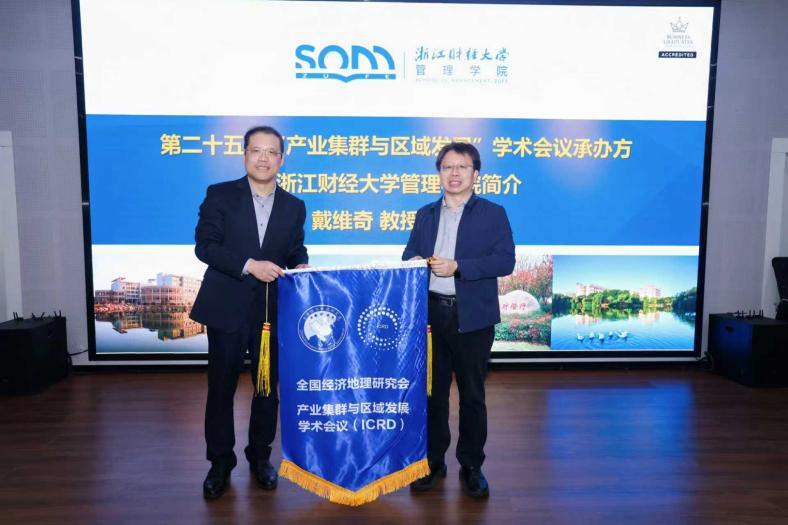 闭幕式上,大会举行了会旗交接仪式。浙江财经大学管理学院副院长戴维奇教授从主办单位代表、北京大学城市与环境学院院长贺灿飞教授手中郑重接过了象征会议传承与责任的会旗。这一时刻标志着ICRD2026的筹备工作正式启动,也宣告了新一届会议进入了“浙江财经大学管理学院时间”。戴维奇表示,管理学院将精心筹备,力争在2026年为大家呈现一场高水平、有特色的学术盛会。