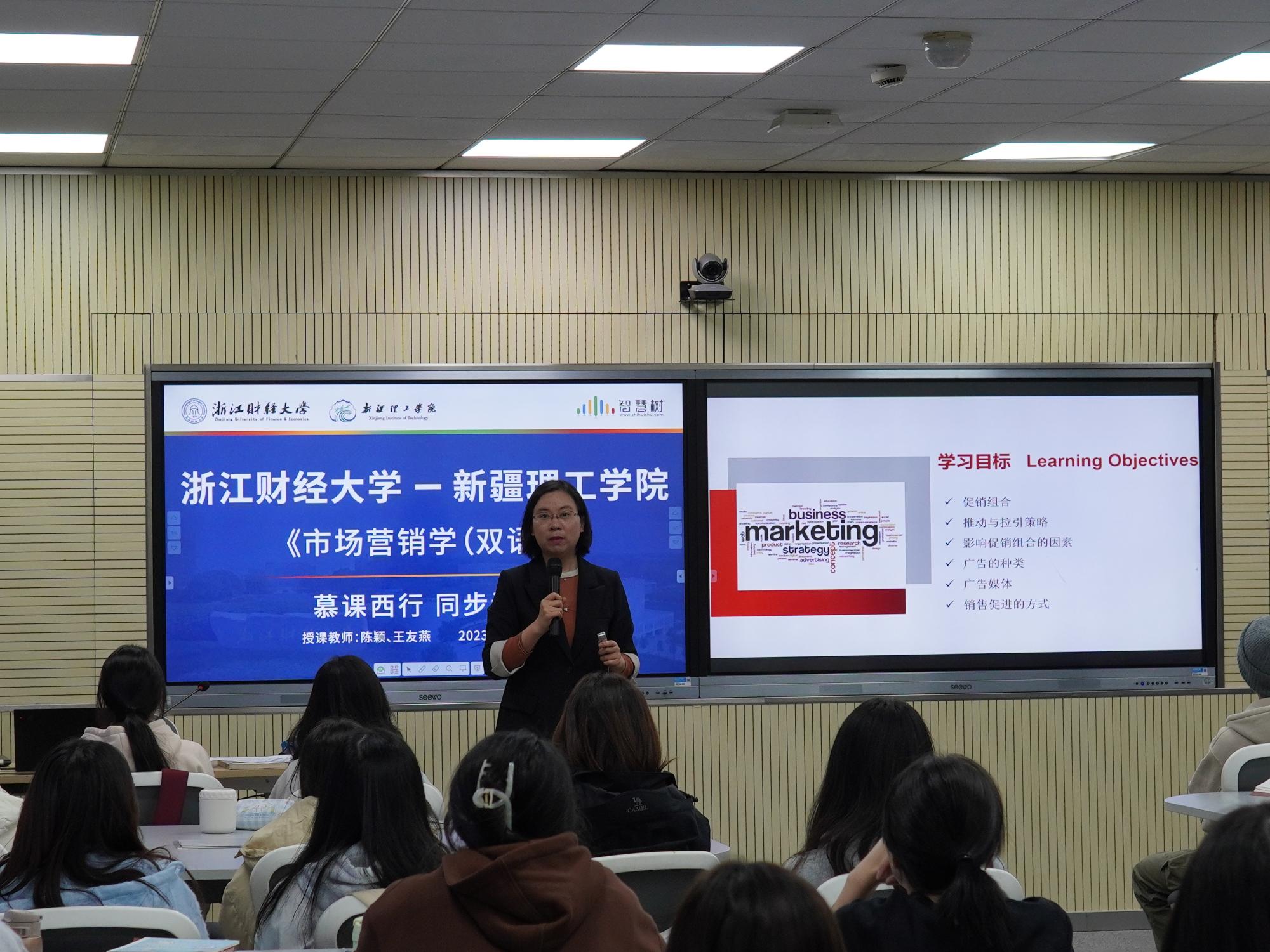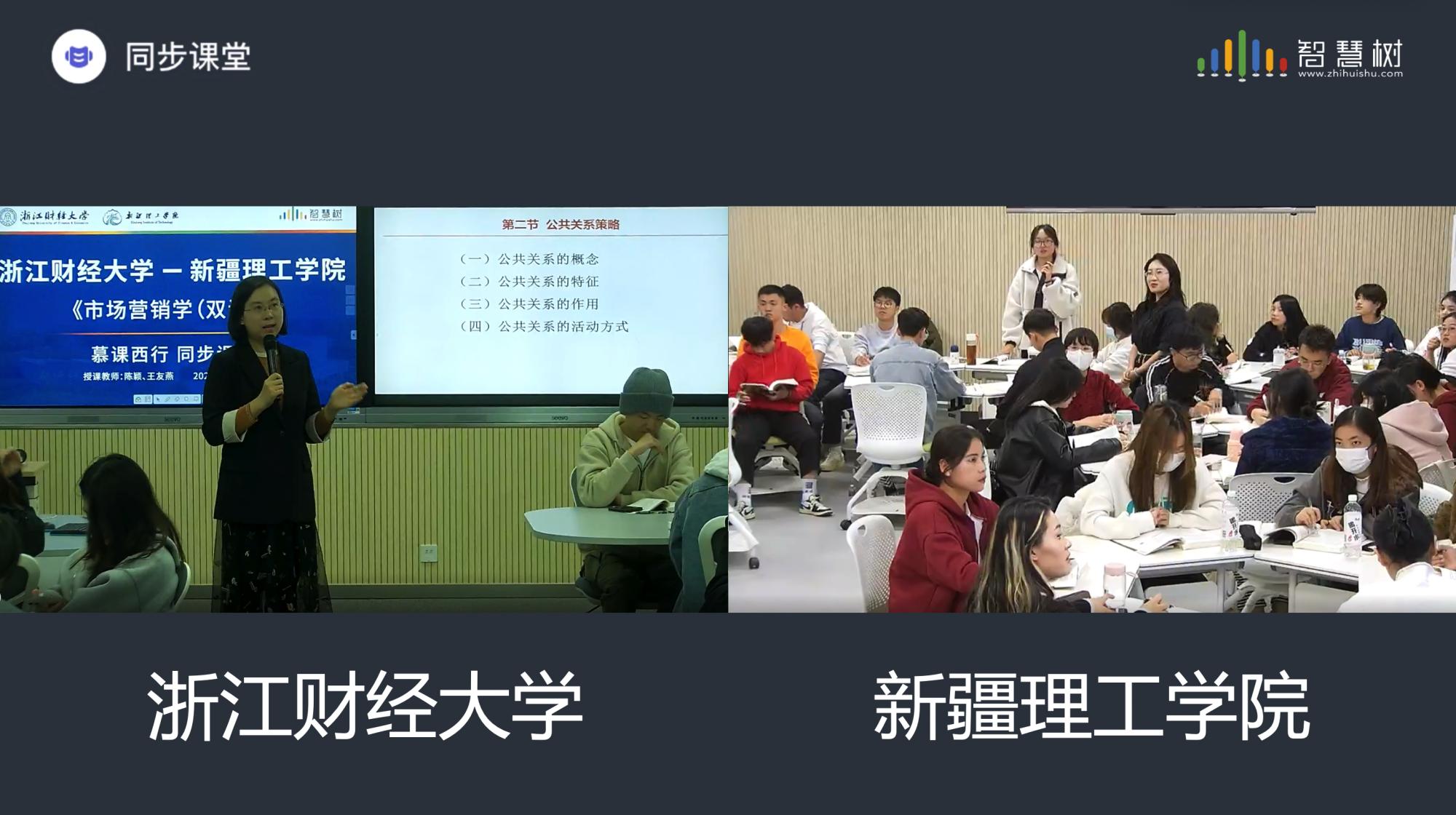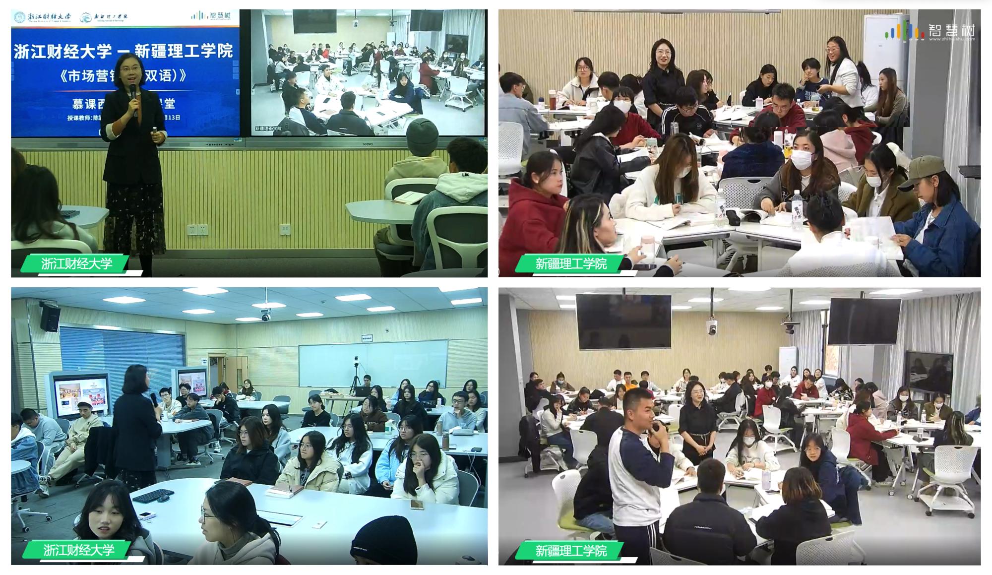 为积极响应教育部“慕课西行”号召,践行“百名教授金课援疆”的使命和担当,推进跨时空、跨区域课程数字化实践,2023年11月13日下午,浙江财经大学与新疆理工学院就《市场营销学(双语)》课程,通过智慧树平台开展了跨越4700公里的同步课堂活动,得到两校师生高度好评。