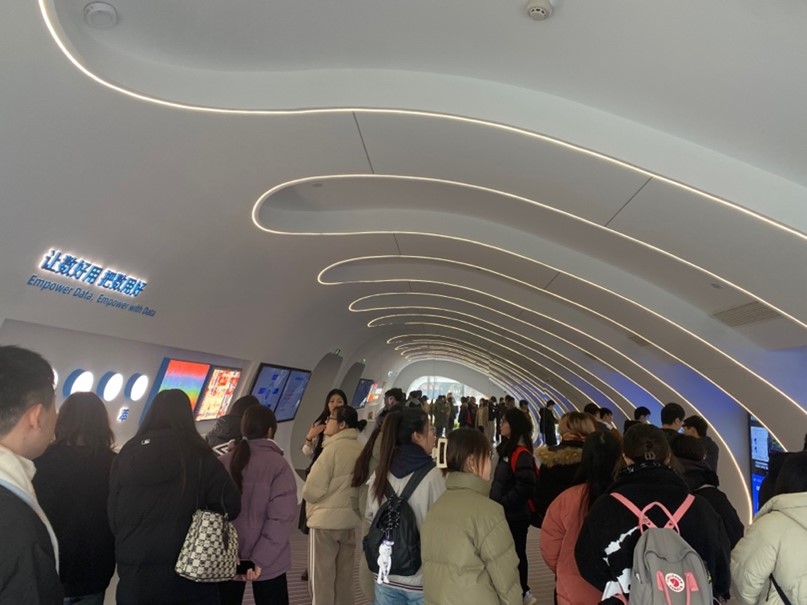 初到每日互动公司,同学们充满了学习的好奇和热情,在讲解人的带领下,参观了公司各个部分的展厅,从公司的发展历程着眼,深入探究了公司的品牌文化、发展战略。“社会效益大于经济效益”这一理念在整个参观过程中贯穿始终,从初创、迭代到转型、发展,个推朝着“让数好用,把数用好”的目标一步一个脚印,深耕数据智能领域,做脚踏实地的创新者和实践者,让同学们真切感受到了技术和数据的力量。