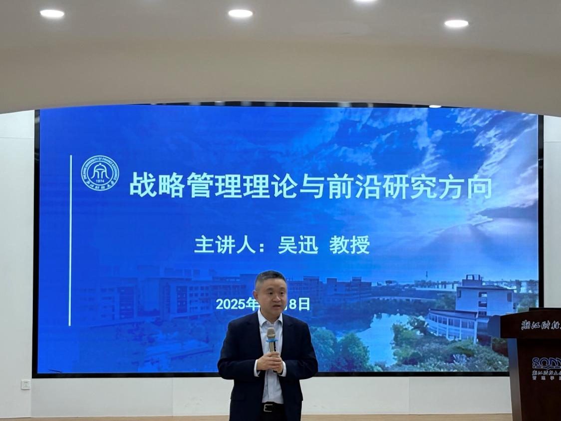 12月8日,密歇根大学罗斯商学院吴迅教授应邀访问浙江财经大学管理学院,为国内外师生带来题为《战略管理理论与前沿研究方向》的专题讲座。吴教授以即兴互动形式,从科研实际问题出发,深入浅出地分享了战略研究的关键路径与学术写作的提升之道。