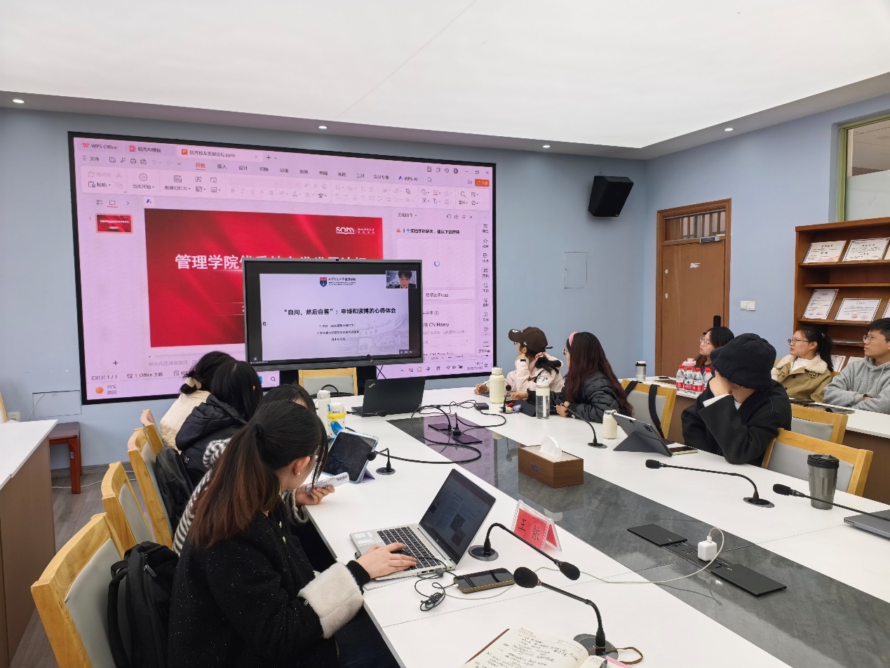 目前于西安交通大学攻读博士学位的叶国涛校友,为同学们带来了申博与读博的经验分享。他建议同学们日常多研读文献、主动思考、坚持学术写作并积极投稿,积累科研成果以提升核心竞争力。此外,他还结合自身面试经历,提醒同学们在申博过程中既要保持自信,也要学会调节心态,从容应对各类挑战。