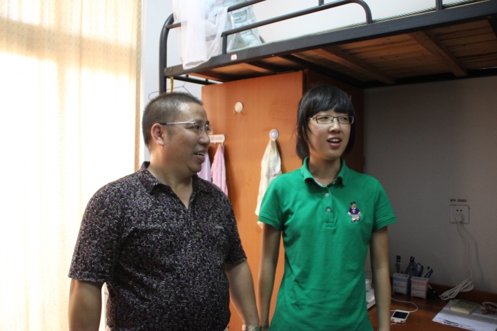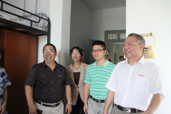 烈日之下,陈院长一行人首先来到51幢男生宿舍楼。在寝室里,他亲切地与同学们聊天,询问他们入学以来学习、生活情况。平易近人的笑容,温暖的话语,一下子拉近了新生与学院领导间的距离。走访过程中,尤书记分外仔细地注意到了各寝室蚊帐的平整情况,并称赞了部分男寝将蚊帐悬挂平齐的细致入微。与此同时,尤书记还跟各寝室长提到,自身的管理水平应从管理寝室开始培养。