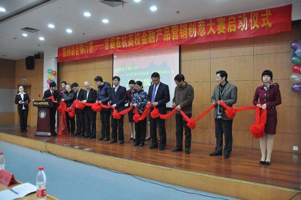 3月20日,杭州联合银行杯---首届在杭高校金融产品营销创意大赛启动仪式在我校学术中心第二报告厅正式拉开了序幕。校党委副书记王宇航、杭州联合银行总行副行长江志达以及我校宣传部、学生处、团委等部门负责人出席了开幕式。