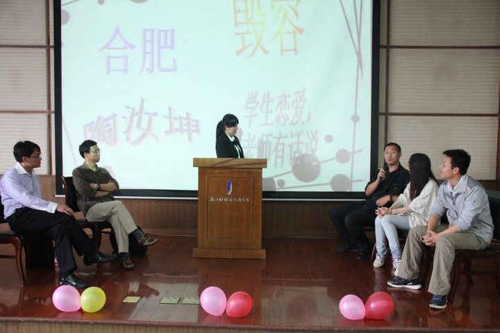 下午1点30分,活动准时开始。在主持人对活动进行了简短的介绍后,有关于“未来选择”“恋爱处世”“生活杂谈”三个主题的大讨论也随之展开。本次活动以近期相关的社会时事为线索,向现场的老师及同学们提出了贴近生活而又极富争议性的问题——对考研、考公务员热有什么看法,对职业的选择有什么建议与规划,对大学生恋爱持有什么态度,学生应如何摆正自身价值观等问题一个接一个出现在屏幕上。老师们将自己丰富的阅历结合切身的体会,就相关问题作了独创性的回答。幽默的语言加上缜密成熟的思维方式,使同学们的困惑得到了很大程度的解决。而台上台下的同学也积极主动与老师展开交流互动,使现场一直处于和谐、热烈的氛围之中。