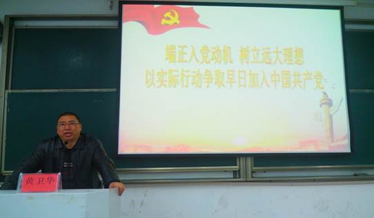 党委书记黄卫华老师主讲,黄老师围绕着“端正入党动机”这个主题进行了深层次的讲解。黄老师指出,我们要端正入党动机,保持思想纯洁。他从端正入党动机的长期性和主要途径告诉了师生何为理想信念以及如何才能坚定理想信念。他希望全体师生能够端正入党动机,树立远大理想,以实际行动争取早日加入中国共产党。