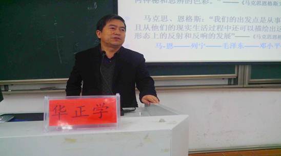 第三讲由马克思主义学院院长兼党委书记华正学老师主讲,华老师从十九大报告中指出的“中国特色社会主义进入新时代”进行讲解。他通过马克思主义经典作家对时代问题的论述强调了时代问题的极端重要性,并且揭示了中国特色社会主义进入新时代的历史必然性。他认为,中国特色社会主义新时代的科学内涵包括五个方面:中国特色社会主义、现代化强国、共同富裕、民族复兴和世界舞台。在讲座的最后,华老师鼓励我们大学生要坚定理想信念,志存高远,脚踏实地,勇做时代的弄潮儿。