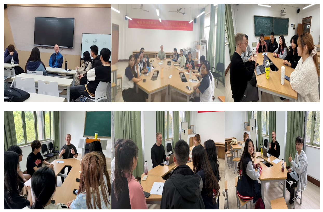 英语角活动每周二在管理学院5号楼固定开展,由经验丰富的外籍教师Jack主持,课程分设老生组(13:30–15:05)与新生组(15:20–16:55),确保不同阶段学生获得更具针对性与参与感的语言实践体验。本学期,中美市场营销项目围绕英语能力提升需求,系统推出“IGNITE English Program”英语专项计划。该计划融合课堂学习与实践互动、线上内容与线下活动、语言训练与文化体验,旨在让英语学习回归“真实交流”的本质,通过“IGNITEYour English, Empower Your Voice”理念,帮助每一位学生点燃语言自信、强化表达能力。