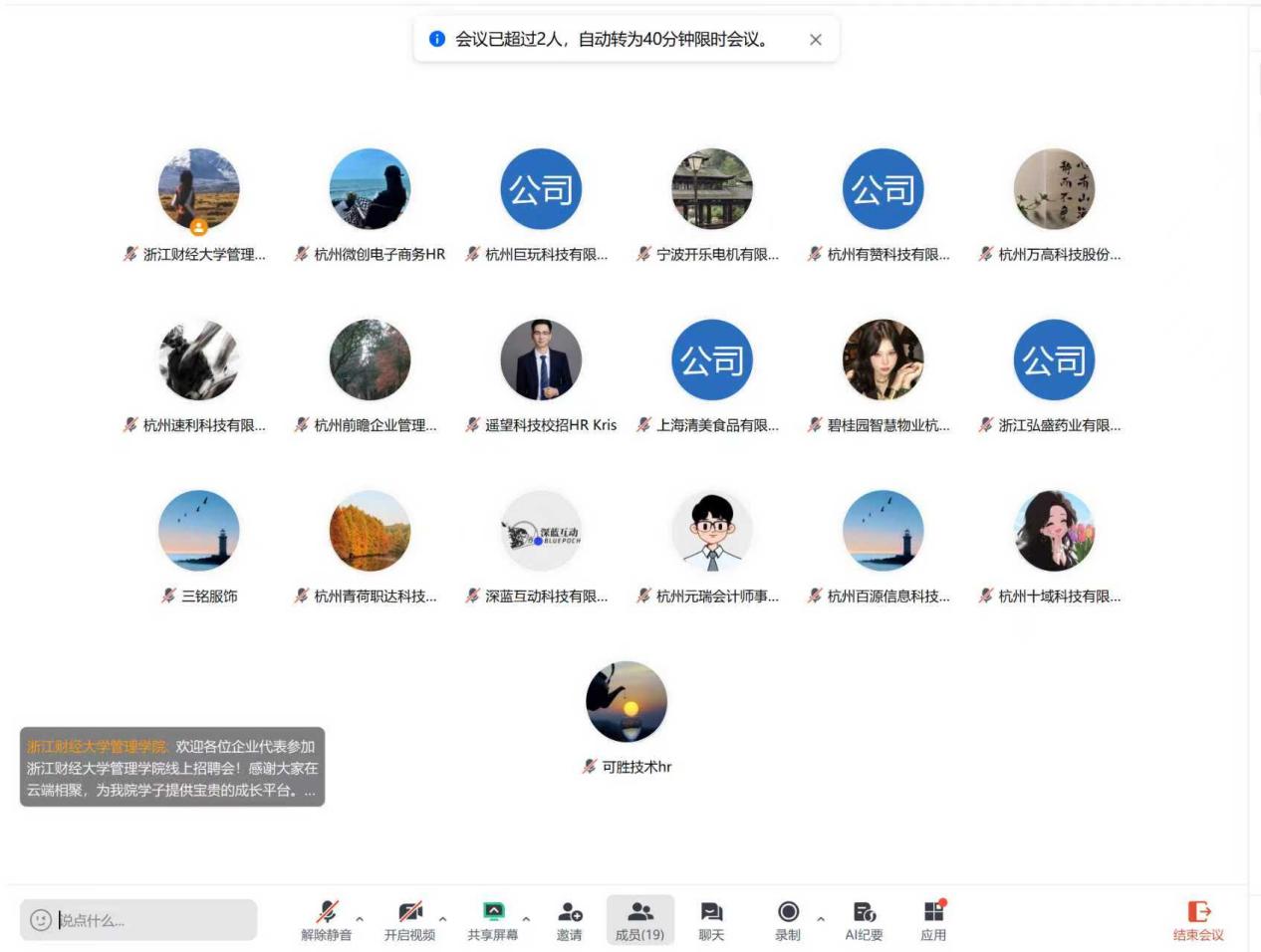 2025年5月15日,浙江财经大学管理学院成功举办线上招聘会,杭州微创电子商务、杭州巨玩科技有限公司、宁波开乐电机有限公司、杭州有赞科技有限公司等19家公司代表参与了本次线上宣讲及招聘对接活动。