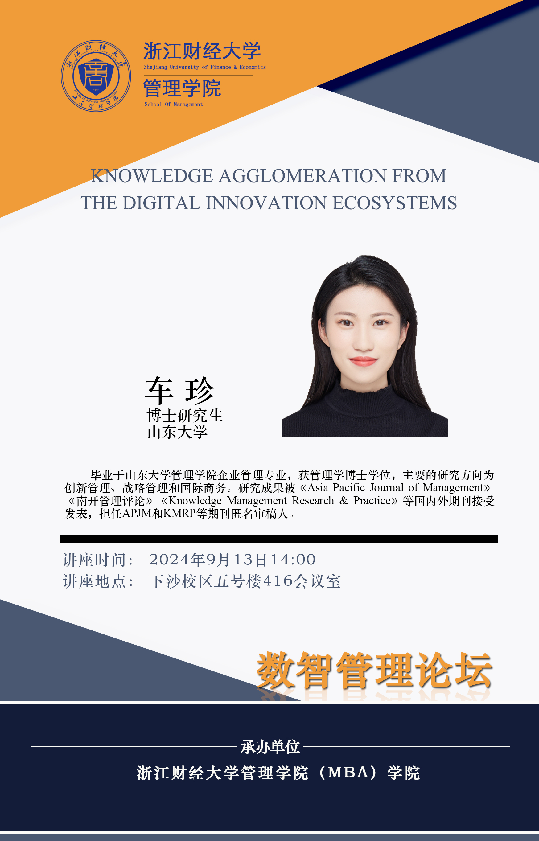 【讲座预告】车珍:KNOWLEDGE AGGLOMERATION FROM THE DIGITAL INNOVATION ECOSYSTEMS