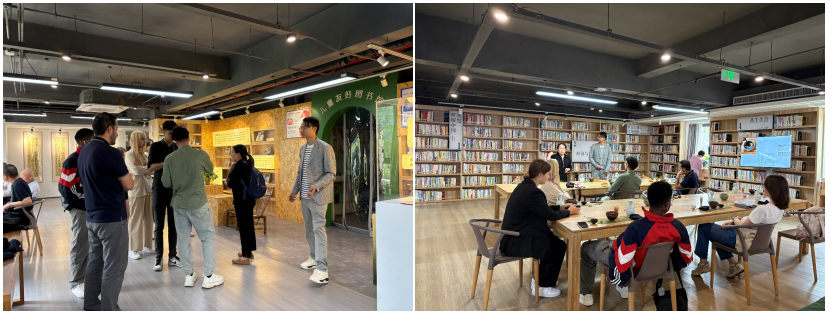 到达载家书房缤纷店后,载家书房创始人罗秋炎总经理首先带国际留学生参观了书房的环境,对书房各个空间的功能和设计进行了详细的介绍。之后,罗经理介绍了书房的运营模式,并重点分享了在创业初期,创业团队的文化建设经验。在互动环节,罗经理对国际研究生提出的企业盈利模式、企业价值观等问题进行了回应。