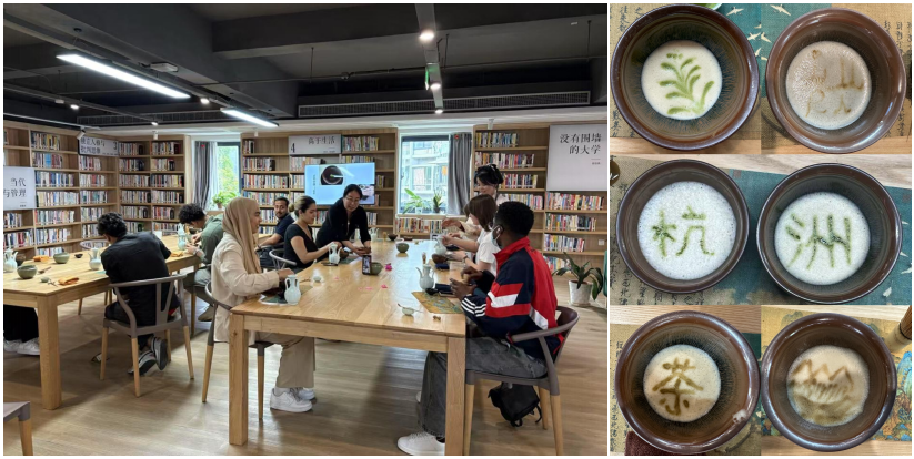分享环节结束后,载家书房为国际留学生安排了宋韵点茶非遗文化活动。点茶是宋代最为兴盛的一种饮茶方式,距今已有一千多年历史,是中国古代茶文化的代表。活动中,茶艺师潇潇老师首先向国际研究生讲解点茶文化的历史,并介绍了点茶所需的茶器和点茶礼仪。之后,在潇潇老师的带领下,国际研究生们体验了整个点茶的过程,磨茶、择水、候汤、击拂、品茗等。最后,在茶香中,国际研究生们发挥想象,在茶沫上勾勒出一幅幅生动的画面,创造了独特的艺术品。