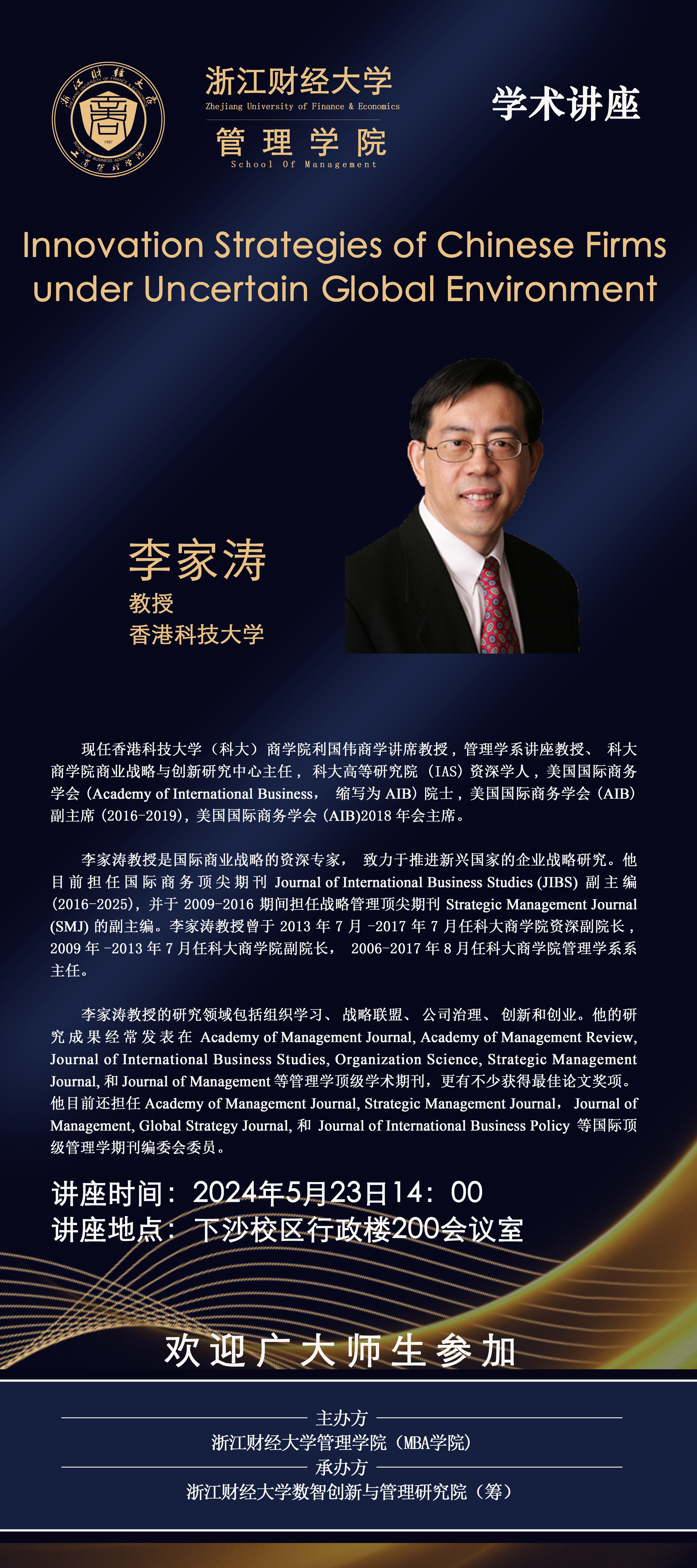 【讲座预告】李家涛教授:Innovation Strategies of Chinese Firms under Uncertain Global Environment