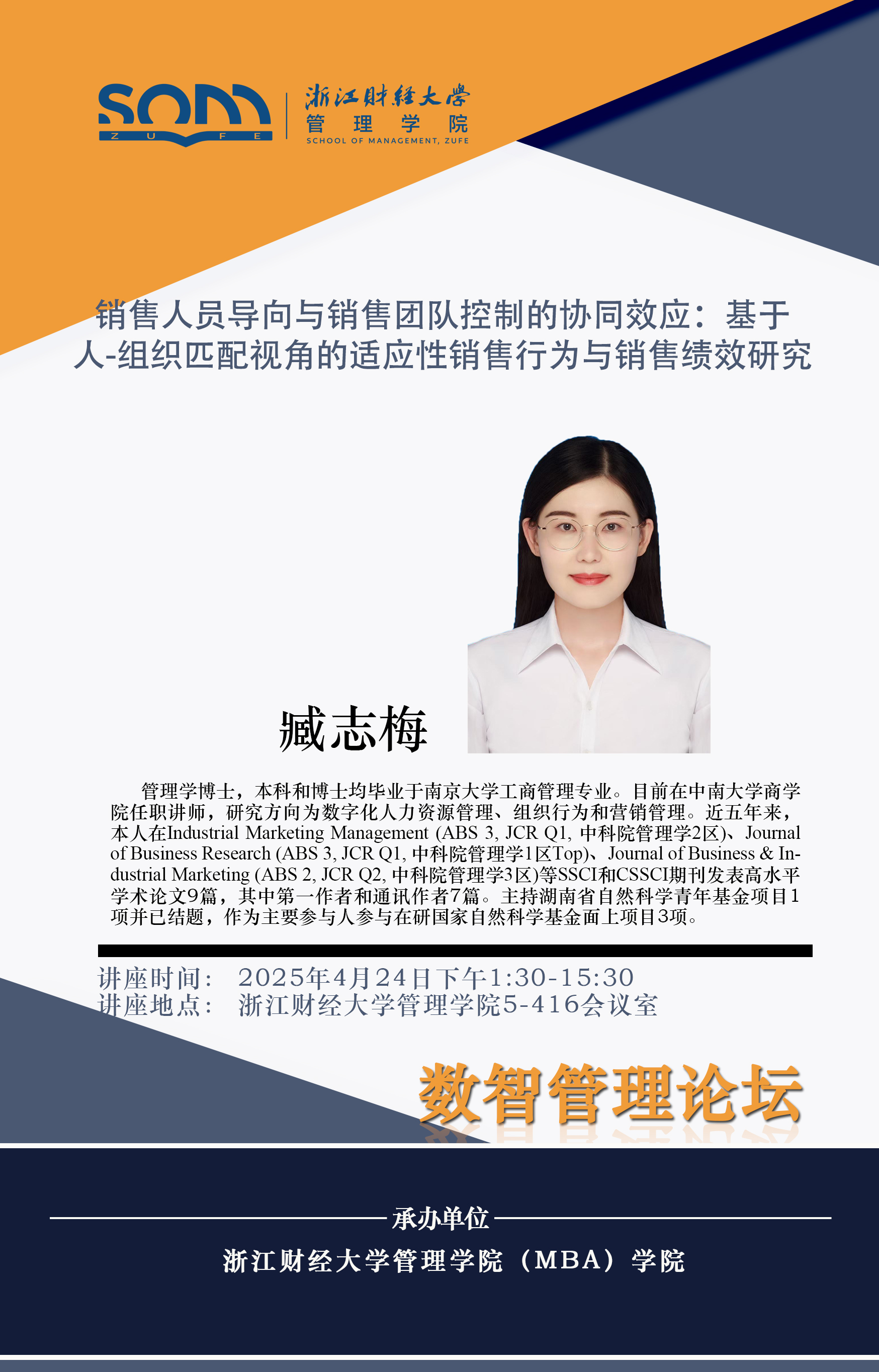 球神直播 新财经战略系列学术活动2025年第23期【学术报告】臧志梅:销售人员导向与销售团队控制的协同效应:基于人-组织匹配视角的适应性销售行为与销售绩效研究