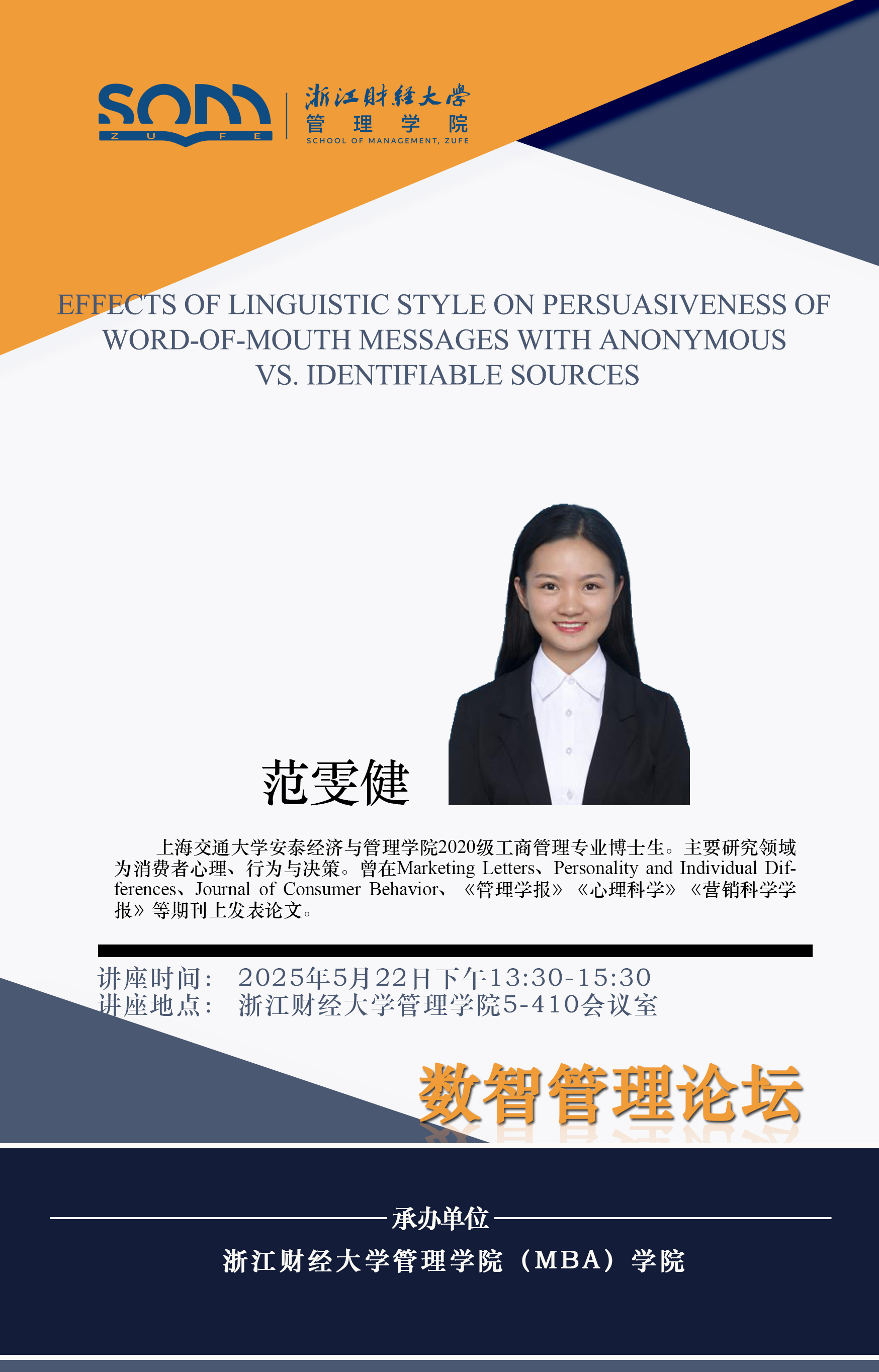 球神直播 新财经战略系列学术活动2025年第36期【学术报告】范雯健:Effects of linguistic style on persuasiveness of word-of-mouth messages with anonymous vs. identifiable sources