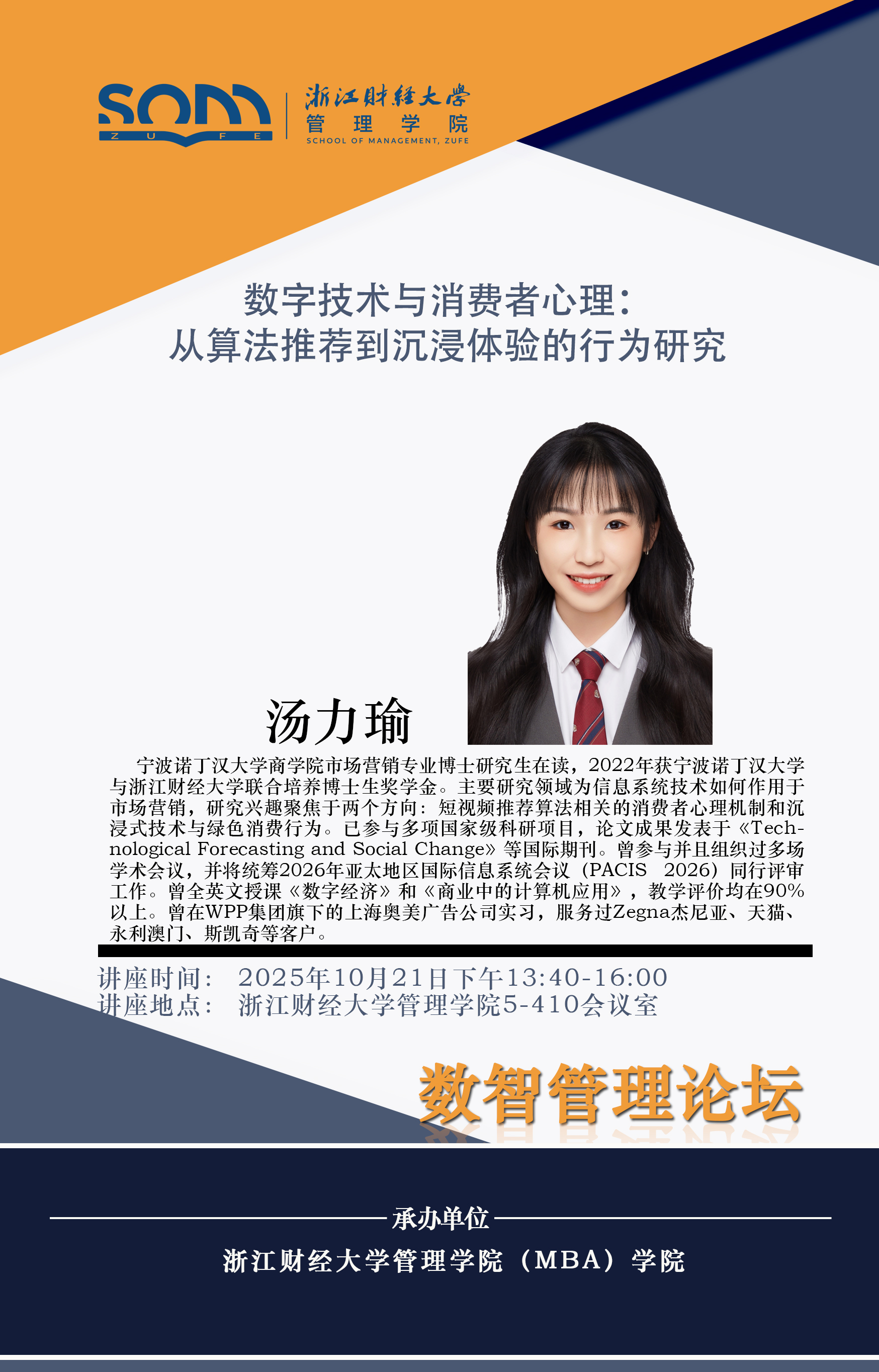 管理学院新财经战略系列学术活动2025年第55期【学术报告】汤力瑜:数字技术与消费者心理:从算法推荐到沉浸体验的行为研究