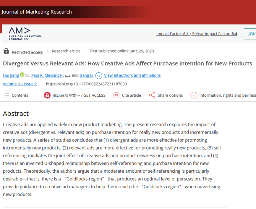 浙江财经大学管理学院杨水清副教授作为通讯作者,撰写的“Divergent Versus Relevant Ads: How Creative Ads Affect Purchase Intention for New Products”(发散型vs.关联型:创意广告如何影响新产品购买意愿)被市场营销类国际顶级期刊 Journal of Marketing Research 录用并发表。